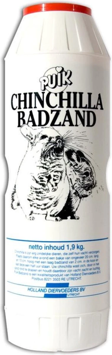 Chinchilla’s zijn erg zindelijke dieren, die zelf hun vacht verzorgen. Plaats daarom elke avond een bakje van ongeveer 20 cm lang en 15 cm hoog met een laag badzand van 2 cm in de kooi en laat dit een half uur staan. Jouw Chinchilla wast zich, door in het zand te draaien en houdt daardoor zijn vacht zacht en luchtig. De bus is voorzien van een strooidop voor optimaal gebruiksgemak. Puik badzand is geschikt voor chinchilla’s, degu’s, hamsters en gerbils.