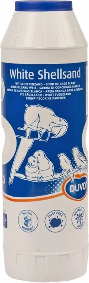 Duvo+ schelpenzand is een bacterie- en kiemvrij natuurproduct. Deze stofvrije bodembedekking voor kooi en volière zorgt voor een hygiënische en frisse leefomgeving voor uw vogels, wat hun algemene gezondheid ten goede komt. De aanwezige schelpen helpen uw vogel zijn zaden en granen te vermalen en beter te verteren. Het toegevoegde oestergrit is een bron van mineralen en calcium en draagt bij tot een evenwichtige groei, goede vederstructuur en een optimale conditie van het skelet. Dankzij het anijsaroma verspreidt er zich een aangename geur in de omgeving van het vogelverblijf. Ververs regelmatig.