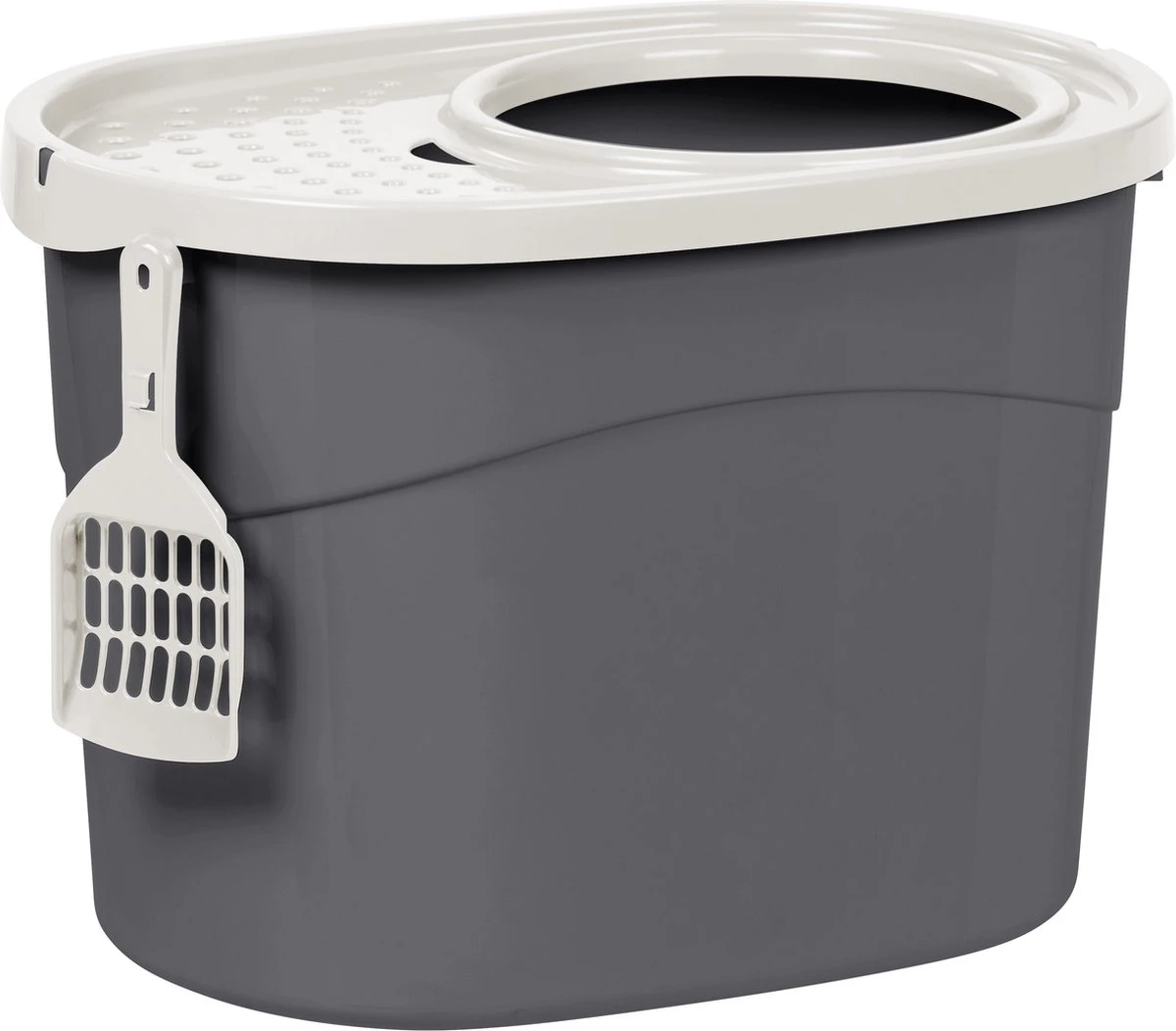De Top Entry Kattenbak is een elegante kattenbak gemaakt van robuust plastic dat past bij elk interieur. Deze kattenbak is gemakkelijk schoon te maken met het inbegrepen schepje. De kattenbak is hoog en goed afgesloten zodat de kattenbakvulling in de kattenbak blijft. Uw interieur blijft altijd schoon doordat de deksel gegroefd afgedekt is. Zo blijven alle korreltjes netjes op de kattenbak wanneer uw kat de kattenbak verlaat. Ongewenste geuren blijven onopgemerkt doordat de kattenbak een diepte heeft van 37 centimeter. Zowel geschikt voor kleinere en grotere katten. Verkrijgbaar in de kleuren Grijs/Wit en Wit/Beige en Zwart/Grijs.