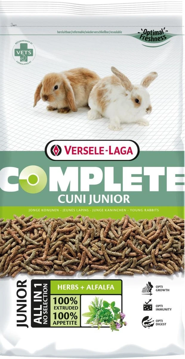 All-in-one – geen selectief eetgedrag mogelijk. Zonder granen. Hoog eiwitgehalte, lange vezels o.a. alfalfahooi, voor een optimale groei. Verrijkt met kruiden voor een optimale maag- en darmwerking.